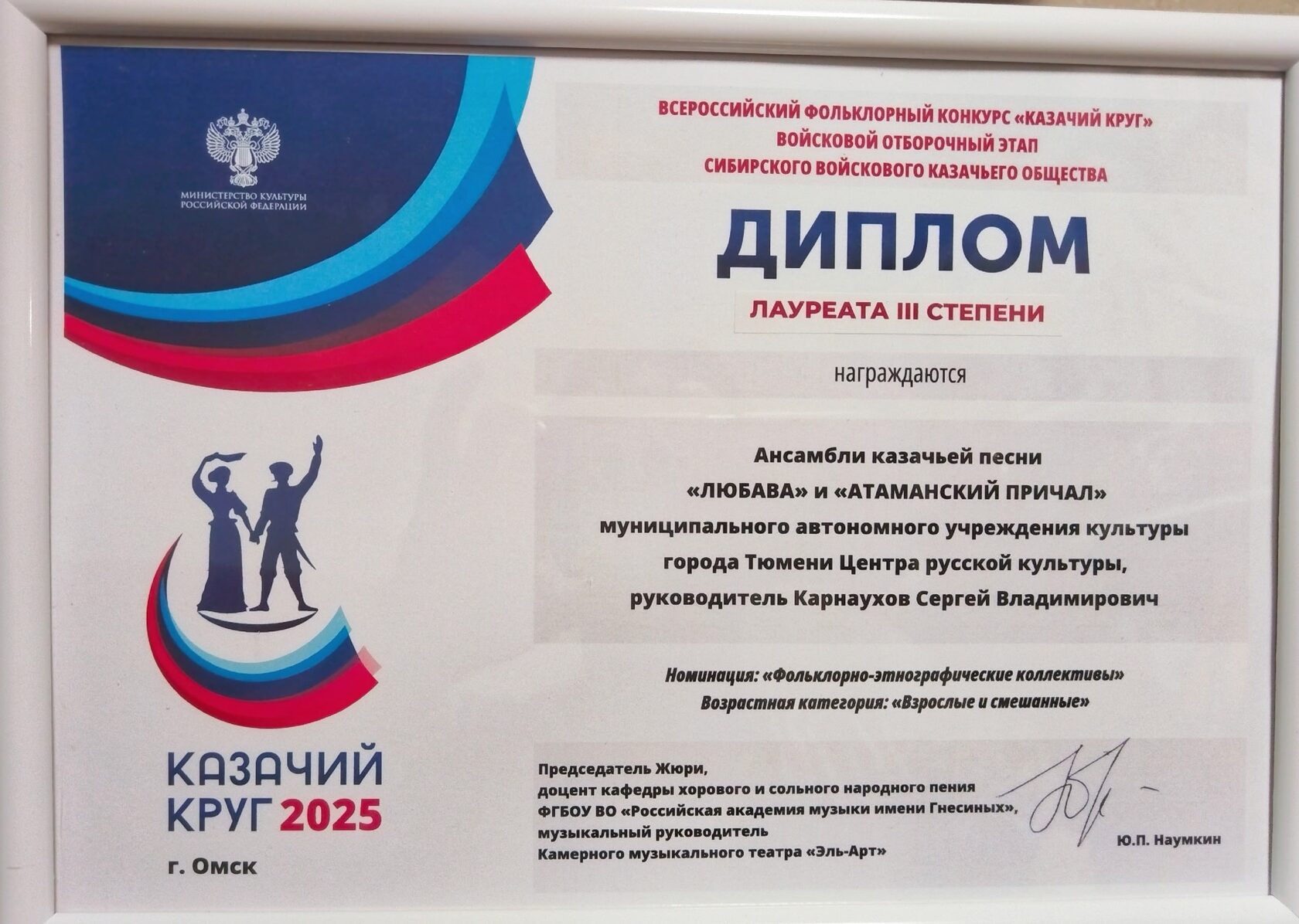 В номинации "Фольклорно-этнографические коллективы», возрастная категория «Взрослые и смешанные», наши ансамбли казачьей песни "Любава" и "Атаманский причал" стали Лауреатами III степени.