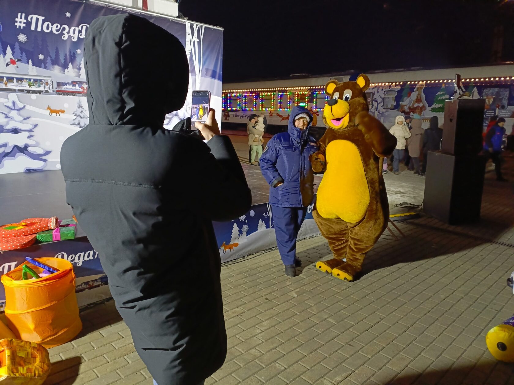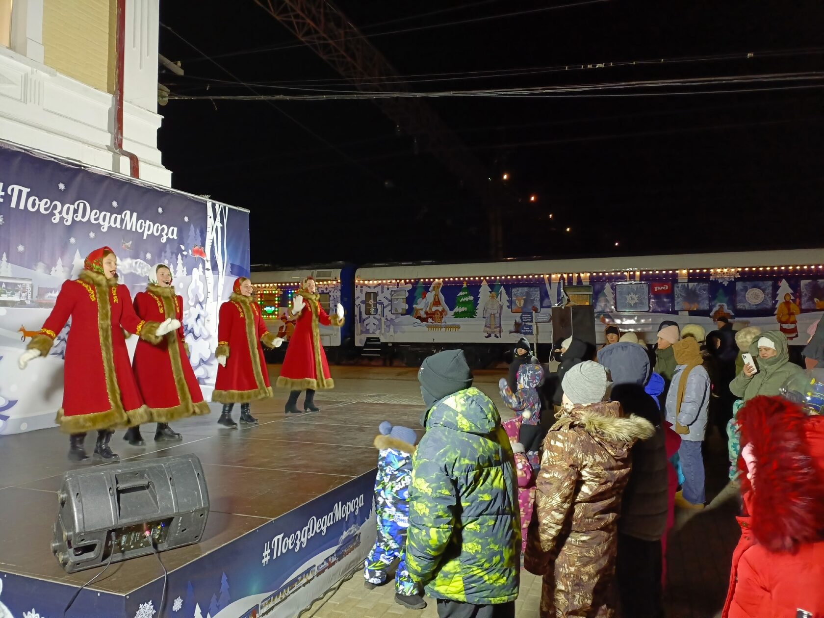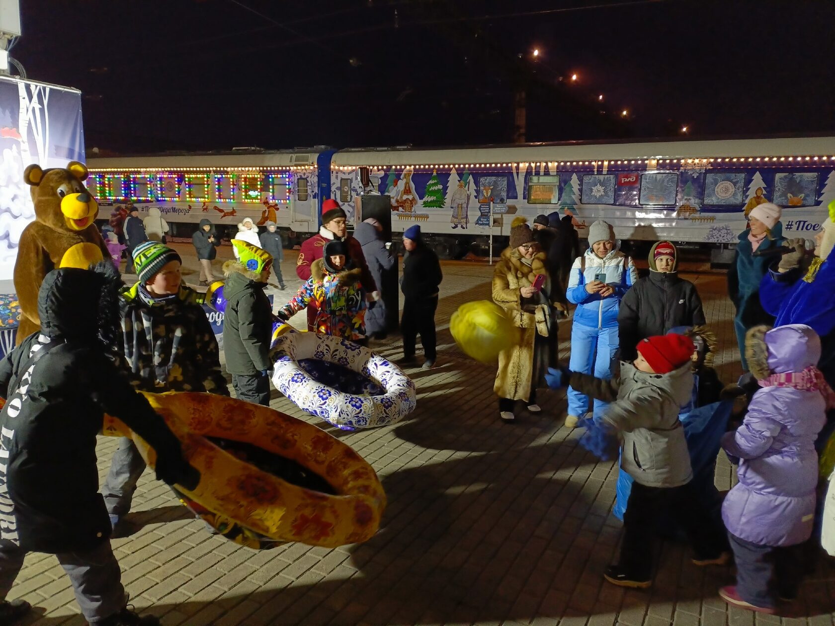 Специалисты и артисты Центра русской культуры оказались среди встречающих главного кудесника страны: мы помогали ему развлекать и согревать активными забавами тех, кто приехал на железнодорожный вокзал за новогодним чудом.