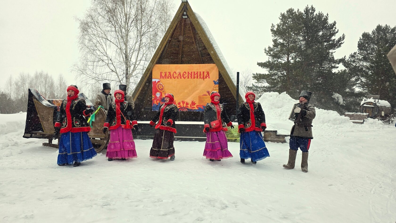 А вот ансамбль казачьей песни «Туринская слобода» жёг чучела Масленицы все выходные — и отжигал, конечно, тоже: 21 февраля наш коллектив стал гостем масленичных гуляний археологического музея-заповедника на Андреевском озере.